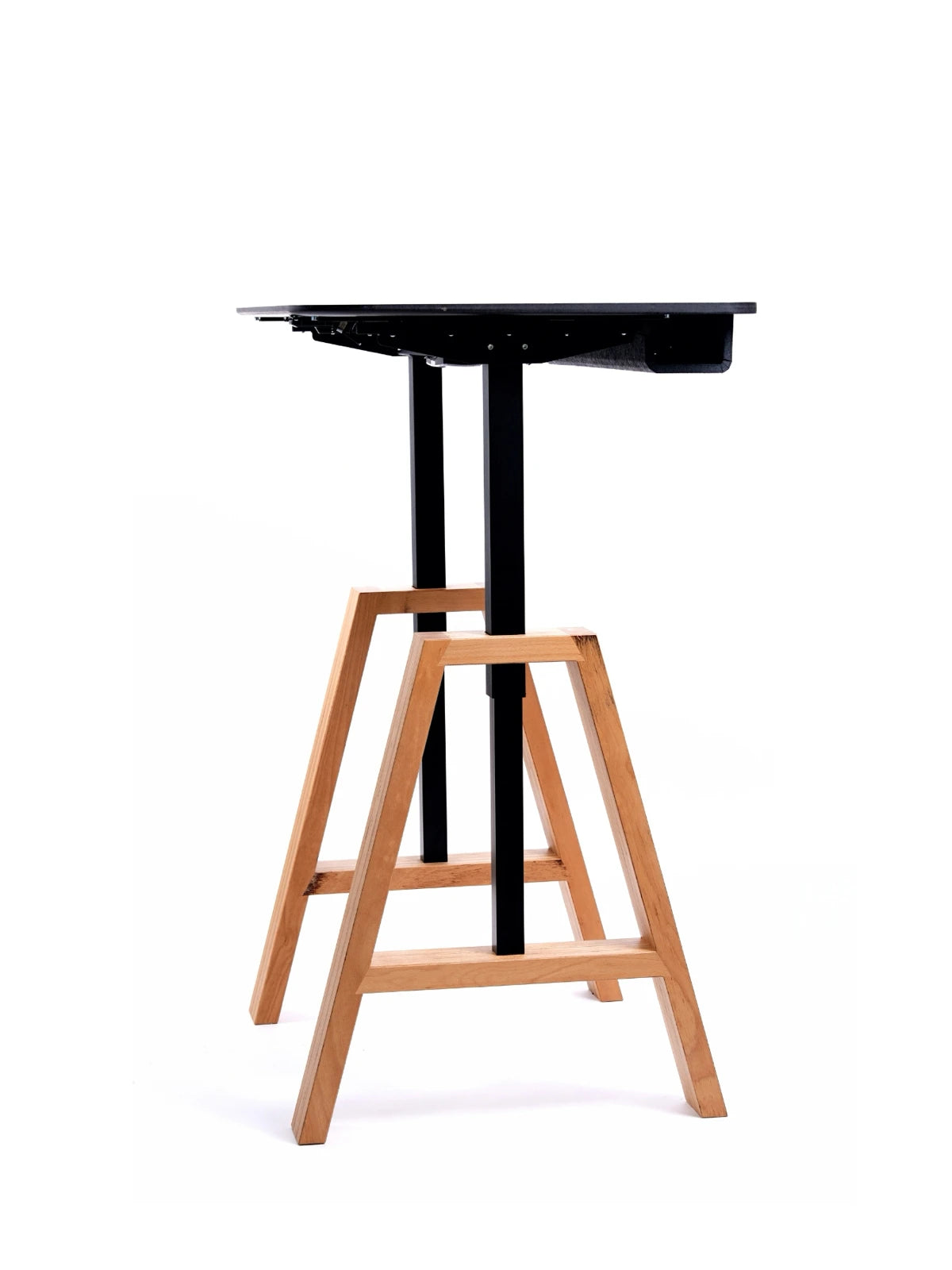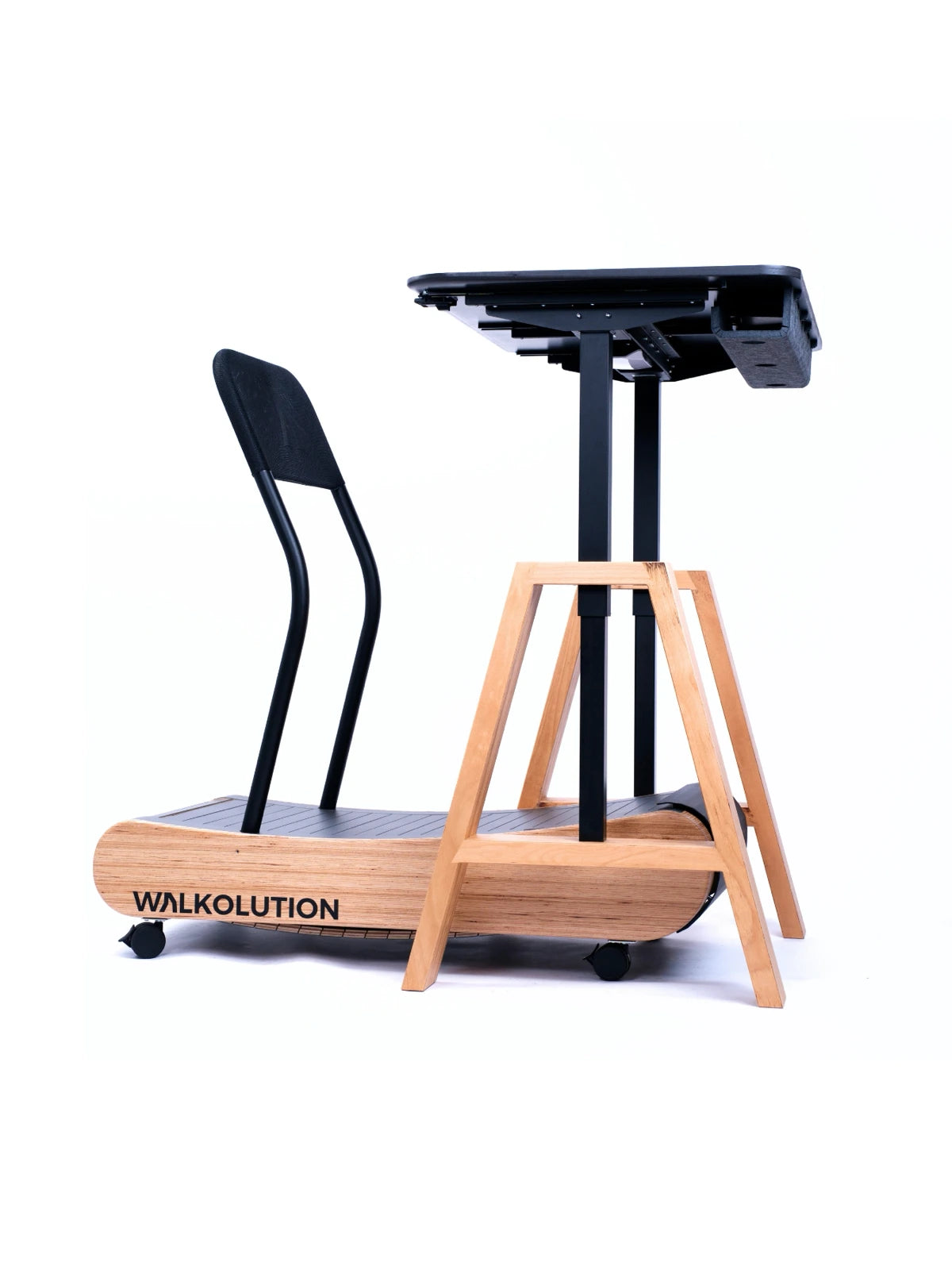 Was diesen Tisch wirklich auszeichnet, ist seine unvergleichliche Stabilität, die selbst bei maximaler Höhe erhalten bleibt – ein Merkmal, das auf dem Markt einzigartig ist. Die Beine sind aus dem gleichen hochwertigen Holz wie die Walkolution-Laufbänder gefertigt und sorgen für perfekte visuelle Harmonie. Die Lederoberfläche ist farblich auf den Laufbandgurt abgestimmt und schafft ein einheitliches und stilvolles Erscheinungsbild.