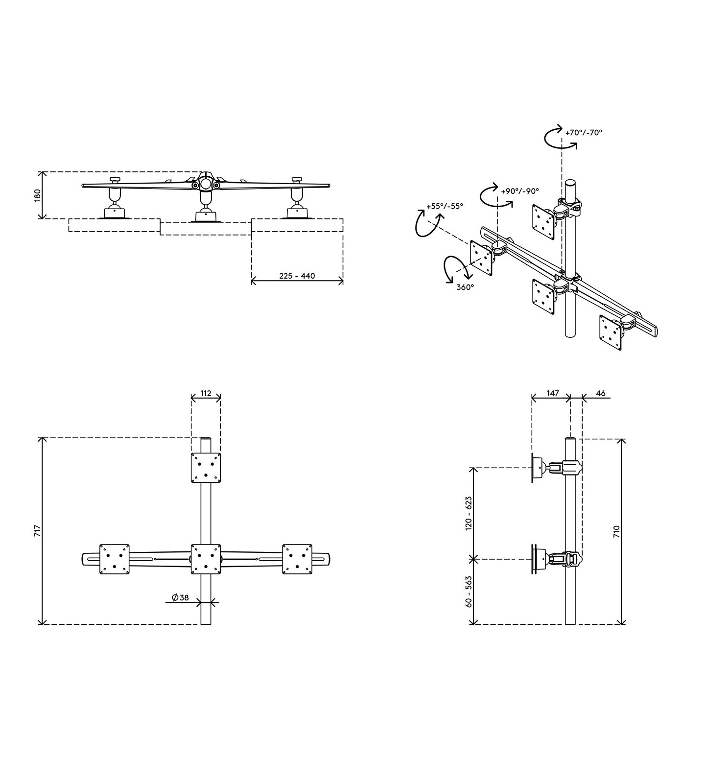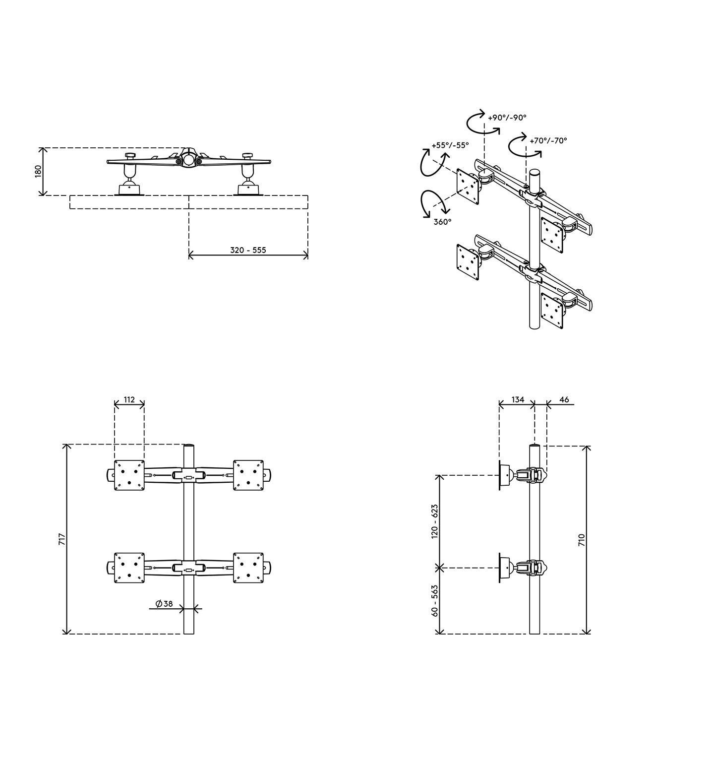 Monitor: Neigbar +55° / -55°, schwenkbar ±90°, drehbar 360°