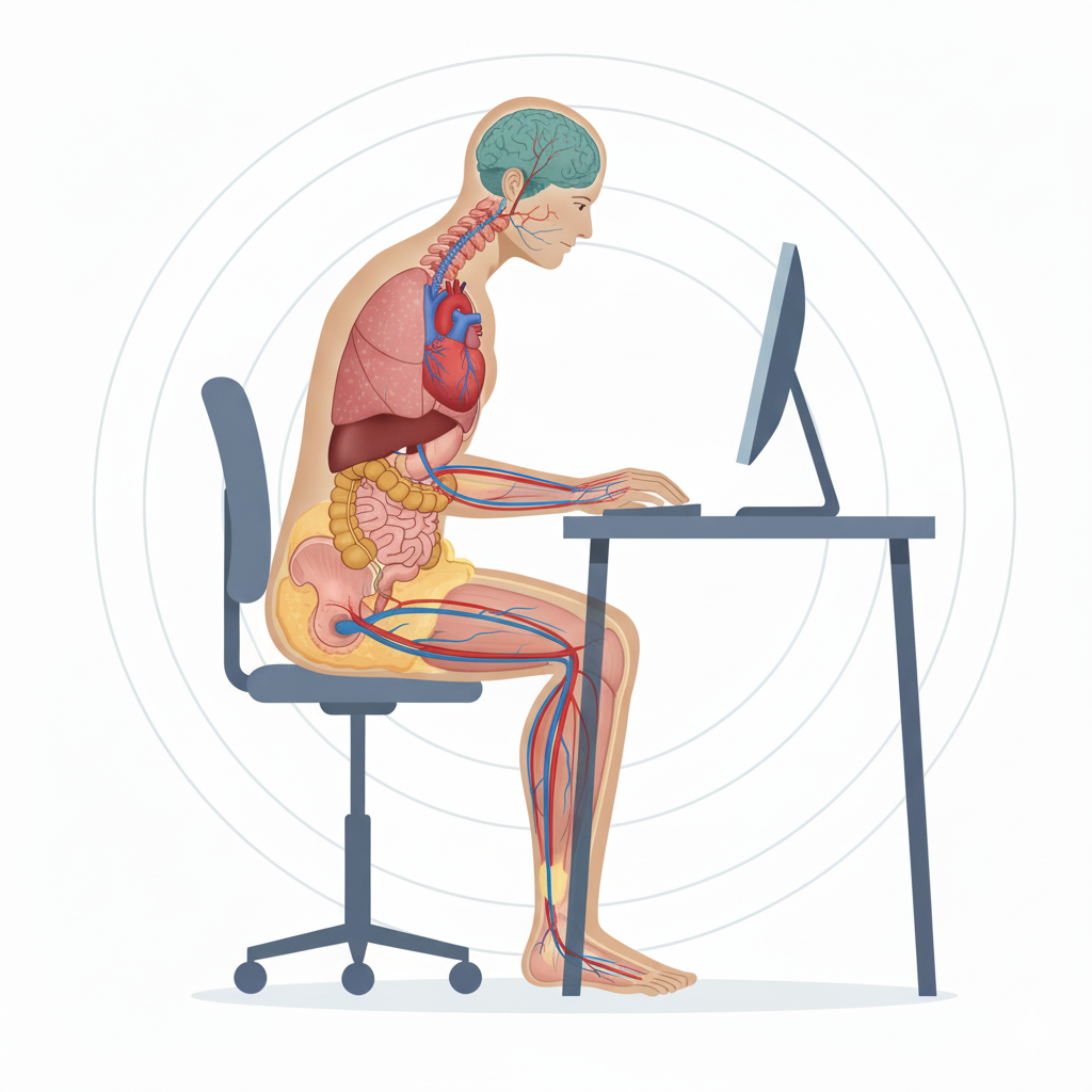 Modern work culture keeps us sitting for most of the day — often more than 10 hours. While sitting may seem harmless, decades of research have proven that prolonged sitting affects nearly every major organ system, increasing the risk of disease and premature death. Below is what happens inside the body when we sit for hours every day.